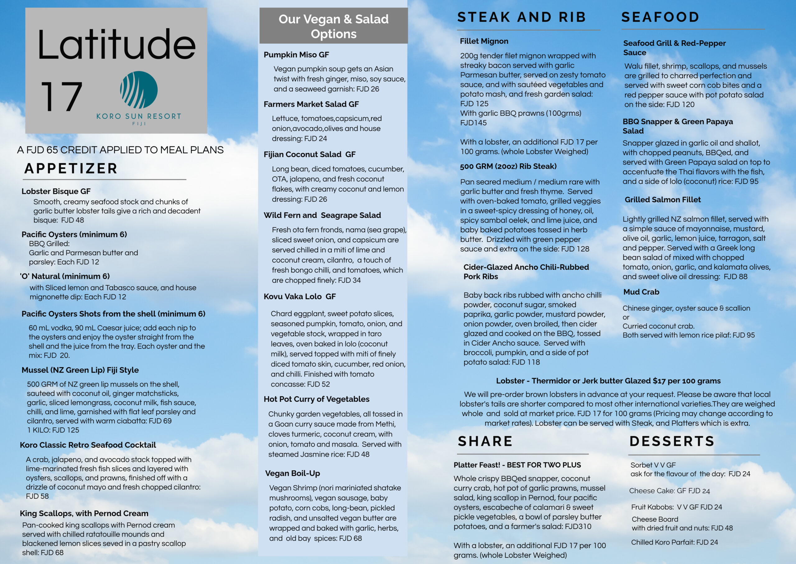 At Koro Sun Fiji Resort, guests can experience the best of seafood and steak cuisine at our Latitude 17 Seafood and Steak Restaurant, which is situated at a prime location on the tranquil Edgewater Lagoon, providing breathtaking ocean views. This restaurant is exclusively open for dinner on Tuesday, Thursday and Saturday evenings. Guests on the meal plans receive a credit of FJD 65 towards their dining experience.