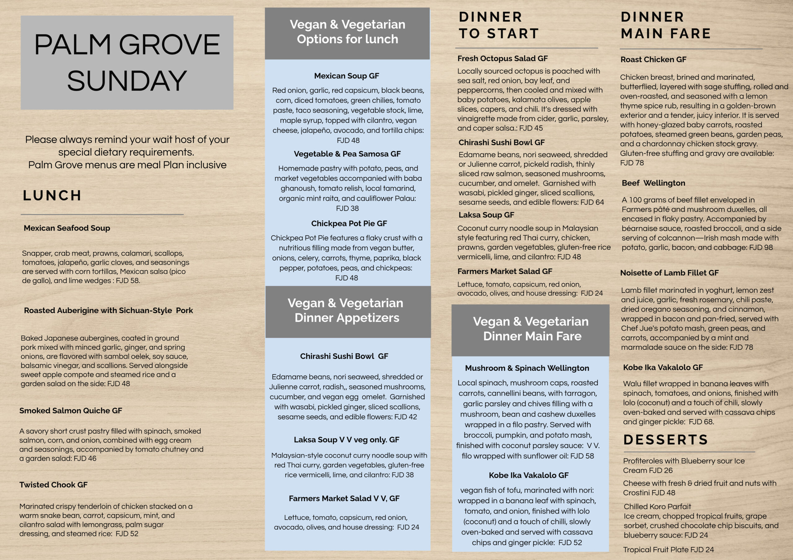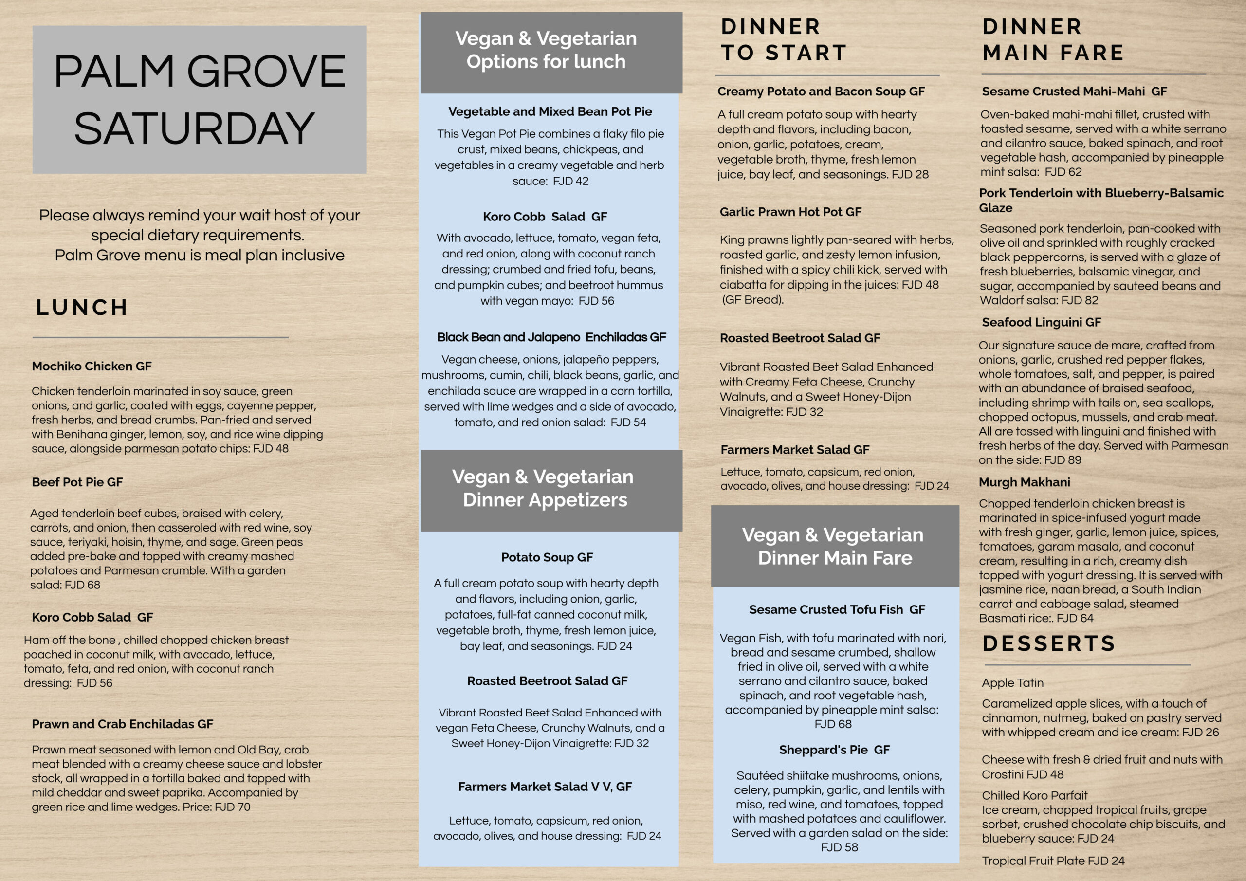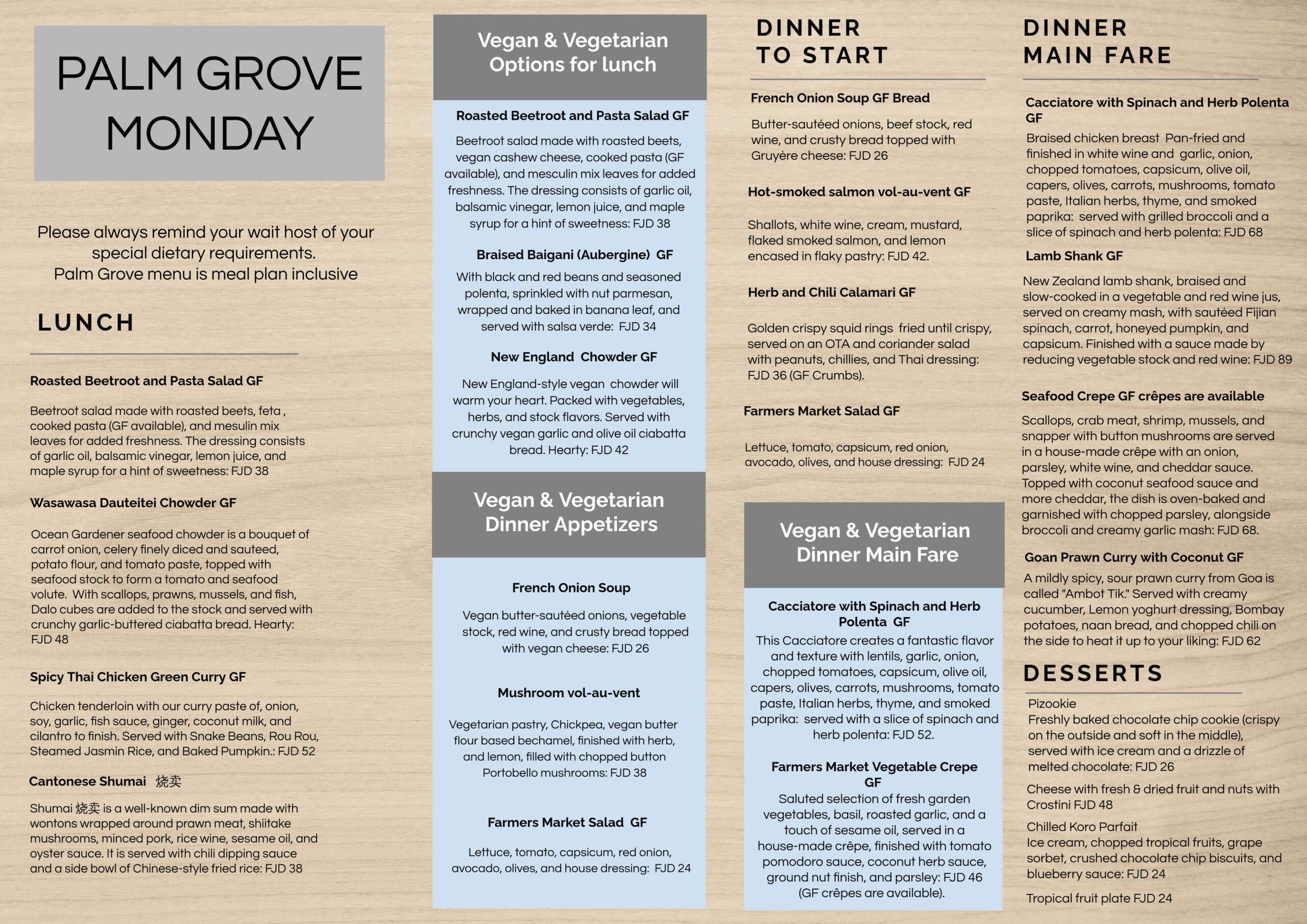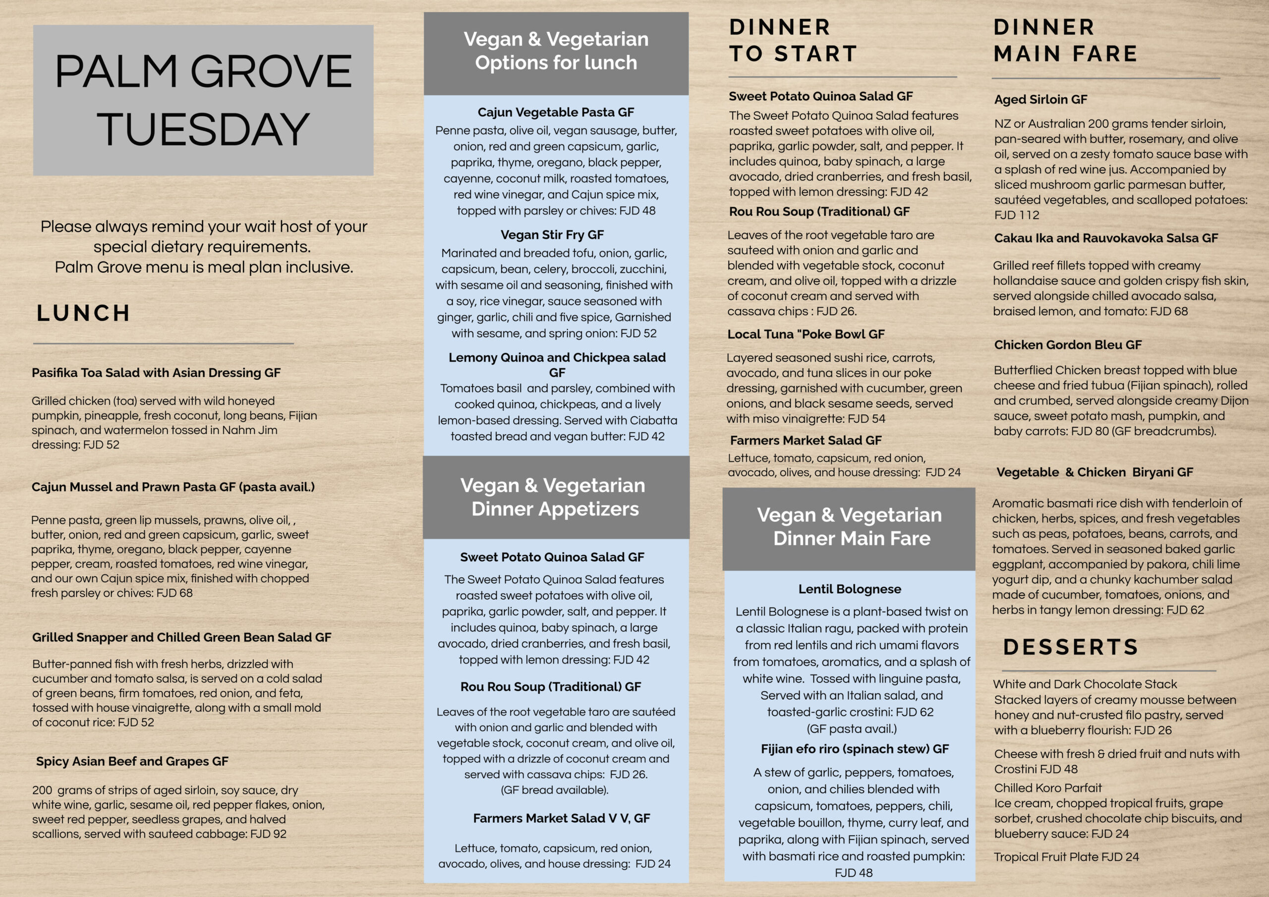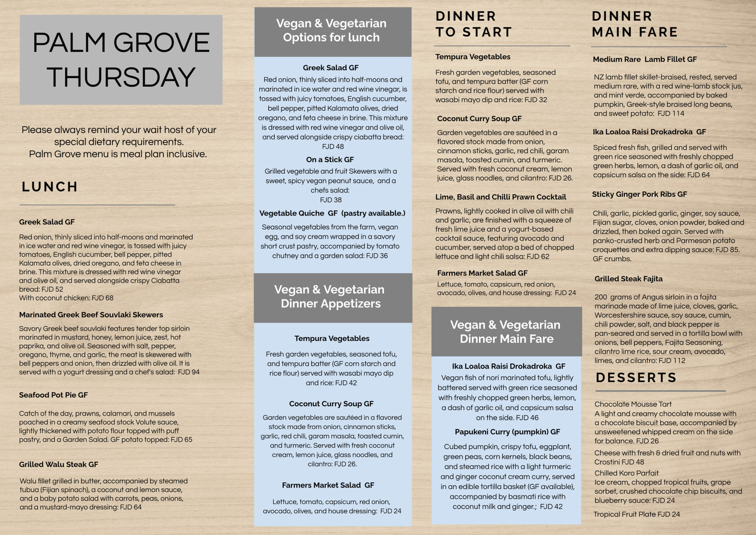 We recommend that our guests select their lunch and dinner at Palm Grove before 12 noon each day to take advantage of our fresh choices. Please note that menus may change periodically to accommodate seasonal and supply differences.
